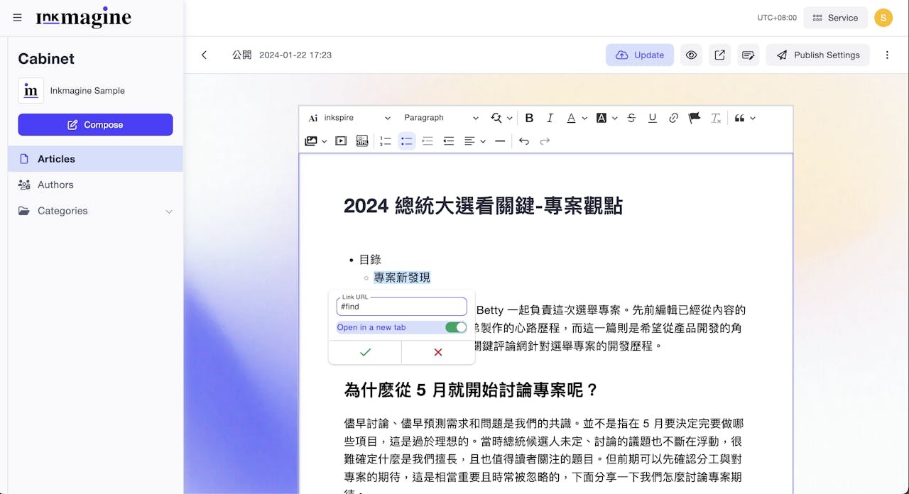 inkmagine 的編輯工具很多,可以供品牌選擇所需要的編輯工具再來使用,減少編輯時尋找工具的時間。若有需要錨點、目錄,請聯繫我們做啟用。