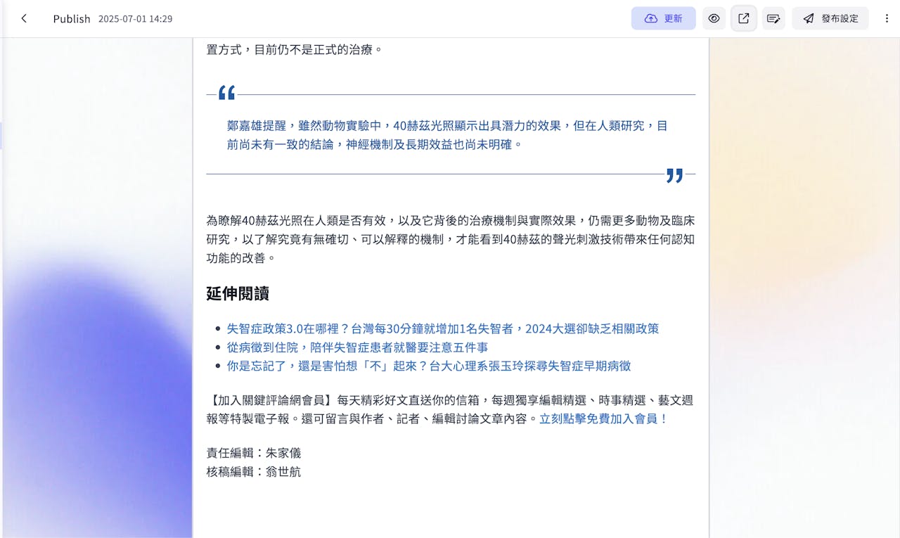 所見即所得是指,能在 Inkmagine 文章管理編輯器內,可看到網頁上的文章樣式,例如引用樣式、標題字體大小、超連結顏色…等等,方便在編輯時,預想發布後的文章呈現。